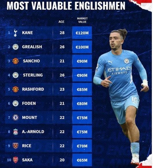 英格兰本土球员方面,热刺的凯恩身价依然在1.2亿欧元,是英超赛场上身价最高的球员。而此前身价也是1.2亿欧元的斯特林则下滑了不少。凯恩之后是格拉利什的1亿欧元,跟着是桑乔和斯特林的9000万欧元,然后是拉什福德的8500万欧元,福登的8000万欧元,芒特和阿诺德的7500万欧元,莱斯的7000万欧元和萨卡的6500万欧元。因为是统计的本土球员,所以德布劳内等人没有计算在内。