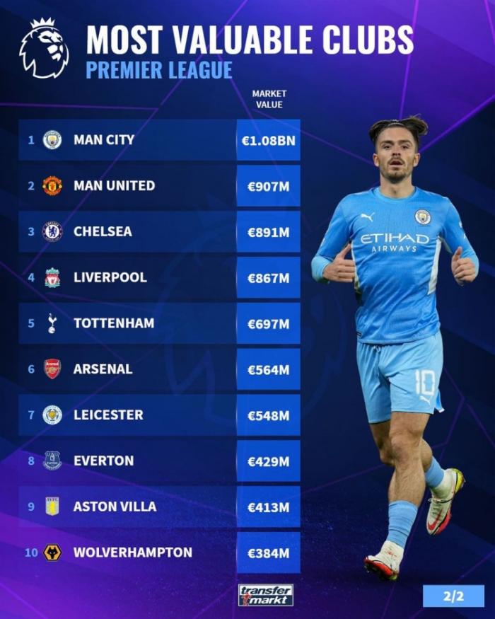 如图,球队方面曼城的总身价是最高的,高达10.8亿欧元,其次是曼联的9.07亿欧元,第三是切尔西的8.91亿欧元。随后是利物浦的8.67亿欧元,热刺的6.97亿欧元,阿森纳的5.64亿欧元和莱斯特城的5.48亿欧元。而第八名是埃弗顿的4.29亿欧元,跟着是维拉的4.14亿欧元,狼队的3.84亿欧元,西汉姆的3.54亿欧元,利兹联的2.59亿欧元,布莱顿的2.57亿欧元,南安普顿的2.55亿欧元,水晶宫的2.49亿欧元,纽卡的2.45亿欧元,布伦特福德的2亿欧元,诺维奇的1.87亿欧元,伯恩利的1.45亿欧元和沃特福德的1.41亿欧元。