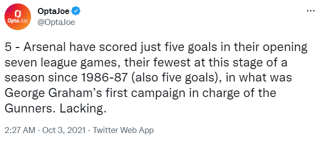 新赛季前7轮联赛,阿森纳一共只打进5球,创造自1986-87赛季以来最差的联赛同期进球纪录。那个赛季,阿森纳前7轮也是只打进5球。