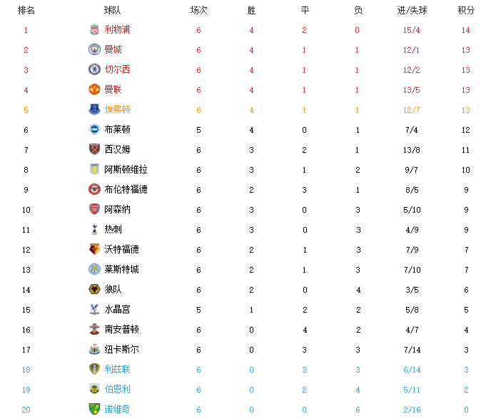 来源:直播车09-27 11:01直播车9月27日讯 ,英超第6轮北伦敦德比落下帷幕,阿森纳主场3-1大胜热刺,收获三连胜,从开局的三连败到如今的三连胜,还大胜了死敌热刺,枪手彻底崛起。本轮英超只剩下布莱顿和水晶宫的比赛没有开始,接下来我们看看英超最新排名: