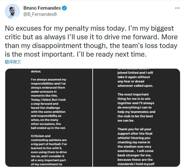 直播车9月26日讯 消息,B费对维拉罚丢点球后在推特上发文,表示自己失点没有借口,而这次经历会激励他继续前行。