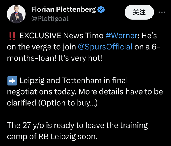 来源:直播车01-06 18:30直播车01月06日讯 ,来自德国天空体育知名记者Florian Plettenberg的最新消息,效力于莱比锡红牛的前锋维尔纳,即将租借加盟热刺半年。莱比锡与热刺正在进行最后的谈判,双方在讨论更多的细节(买断条款等)。如果交易达成,这将会是27岁的德国国脚时隔1年半后,重返英超联赛踢球。