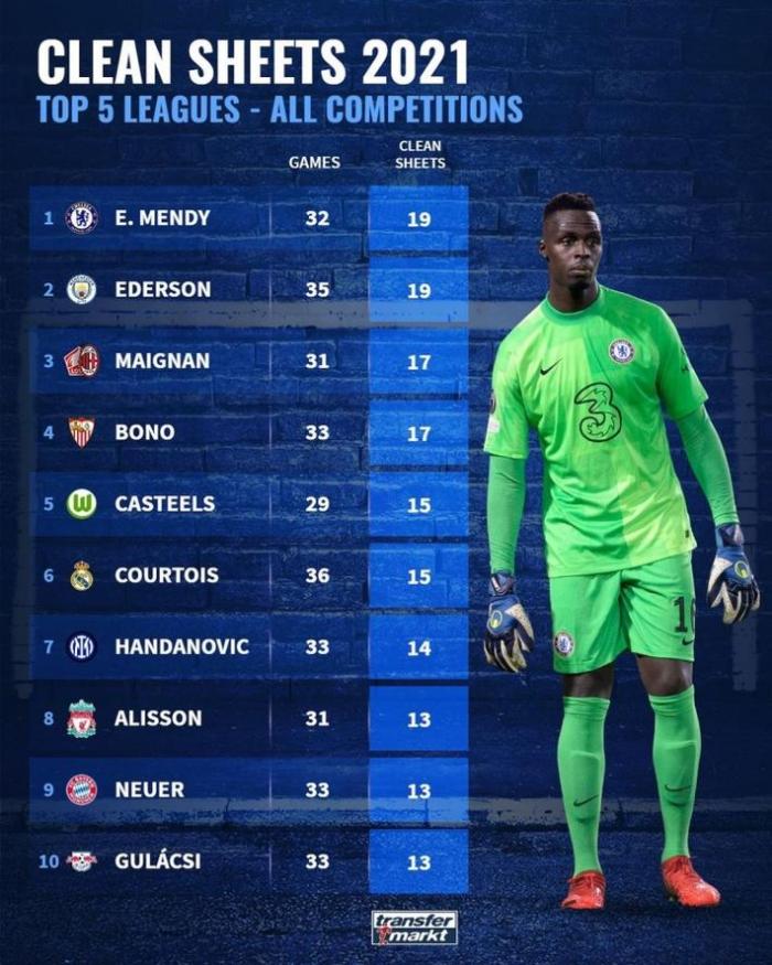 直播车9月24日讯 今日,德转统计了2021年度至今五大联赛门将零封榜,其中切尔西门将门迪排名榜首。