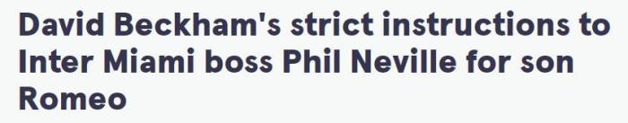 来源:直播车09-22 11:30直播车9月22日讯 据英国媒体《镜报》报道,迈阿密国际主帅菲尔-内维尔在接受采访时表示,贝克汉姆告诉他不要特别照顾自己的儿子罗密欧,反而对他要比对其他人更加严厉。