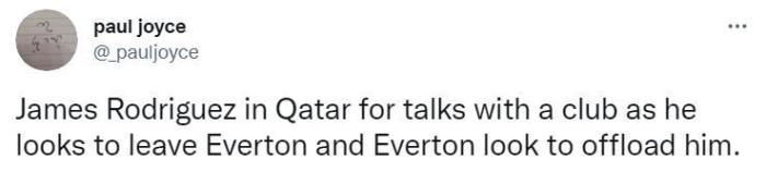 该记者表示,J罗目前在埃弗顿的处境很不乐观,在恩师安切洛蒂离开后,埃弗顿的新帅贝尼特斯还没有让他出战过任何一场比赛。目前埃弗顿希望他离开,球员本人也想另投他处。