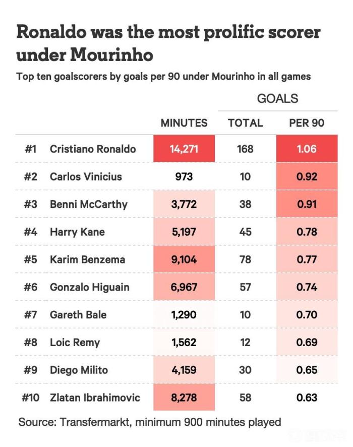 穆帅执教过的前锋效率排行:C罗榜首,维尼休斯第二,德罗巴落榜!