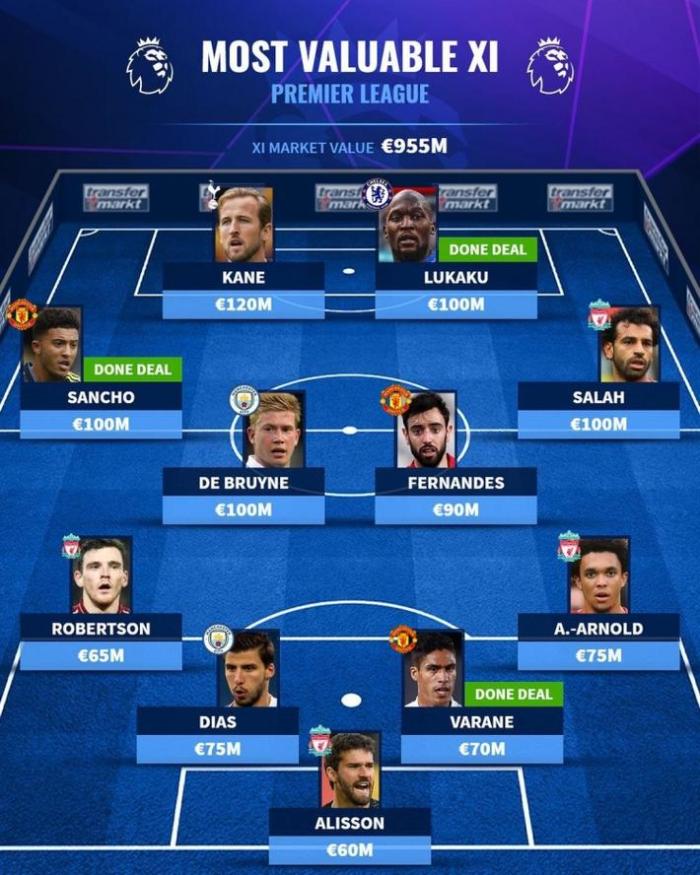 直播车9月07日讯德转盘点了本赛季的英超最贵阵容,其中5人身价过亿,凯恩身价1.2亿欧最高。