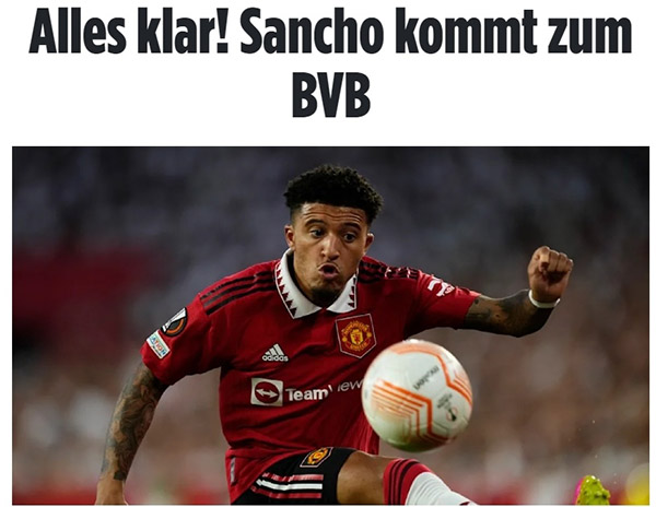 《图片报》表示,多特与曼联的谈判取得了突破性进展,已进入最后阶段,仅剩一些与租借费有关的税务细节有待完成,桑乔将尽快签下至本赛季结束的租借合同。