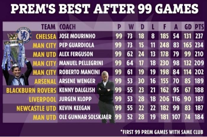 英超主帅执教单一球队前99场成绩:穆帅又是第一,索帅进前十!