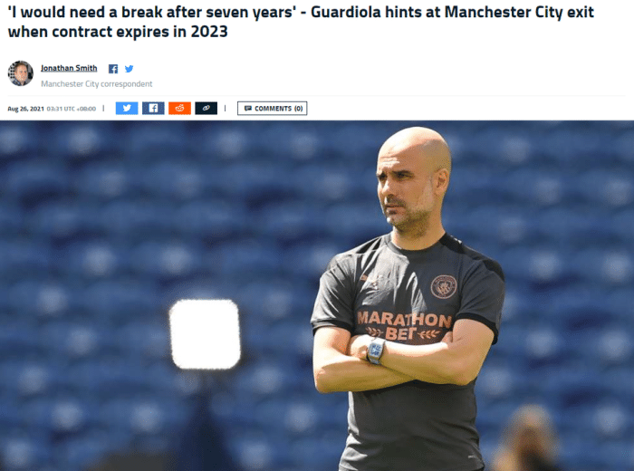 直播车讯 据进球网报道,瓜迪奥拉表示自己想在2023年与曼城的合约到期后休息一下,他称自己接下来可能会执教国家队。