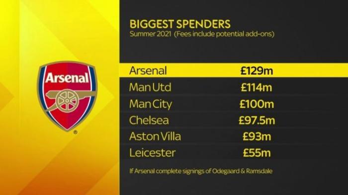 直播车讯 由于阿森纳即将签下厄德高和拉姆斯代尔,因此,有媒体统计,如果加上这两笔交易的转会费,阿森纳今夏的转会支出将达到1.29亿英镑,位列英超球队第一。