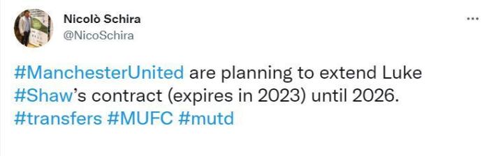 斯基拉写道,曼联打算将卢克-肖的合同延长至2026年,球员现有的合同在2023年到期。
