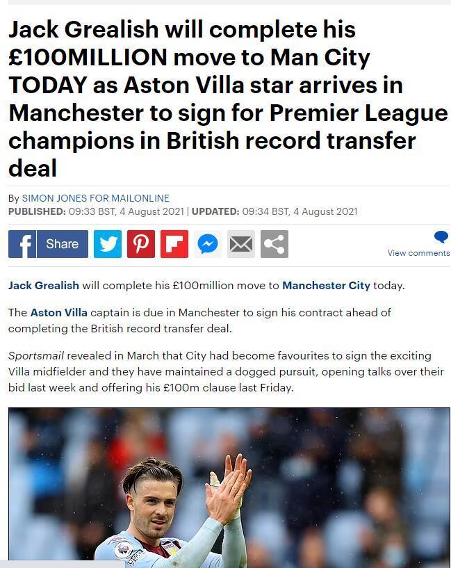 来源:直播车08-05 10:40直播车讯 今日,据英媒《每日邮报》消息,阿斯顿维拉队长格拉利什今天将与曼城签约,转会费1亿英镑。