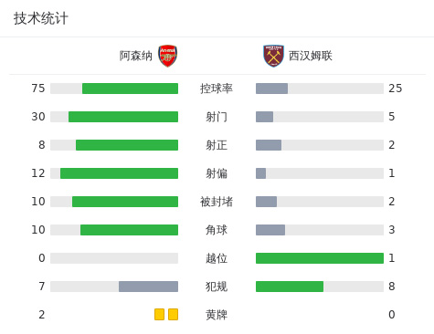 阿森纳0-2西汉姆 枪手狂轰30脚无果近4轮仅1胜