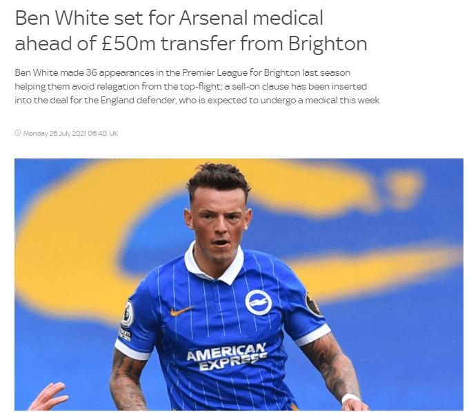 布莱顿拒绝了阿森纳4000万和4700万英镑的报价后,在上周两家俱乐部就5000万镑转会费达成一致。