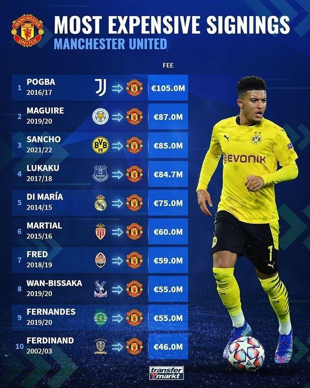 来源:直播车07-24 15:28直播车讯 北京时间7月23日,曼联官方宣布桑乔正式加盟球队,这笔交易花费曼联8500万欧元。随即,德国转会市场盘点了曼联引援转会费榜。