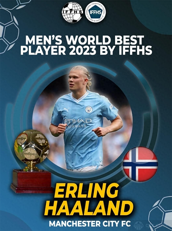 IFFHS:2023年,哈兰德收获欧冠、英超、世俱杯、欧洲超级杯、足总杯五座冠军奖杯,并且一直在全球最佳射手榜上(全年打入50粒进球),他被票选为2023年度最佳男足球员,得分为208分。