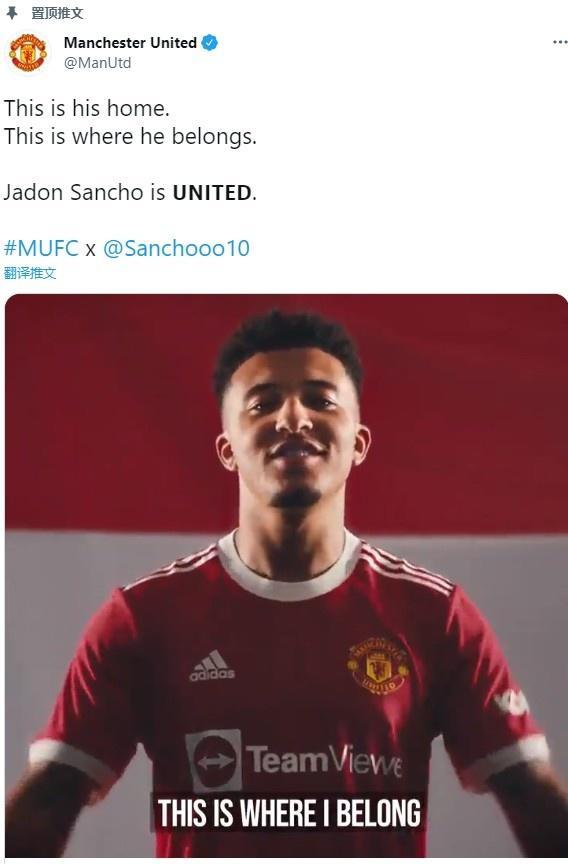 直播车讯 今日,曼联官方消息,英格兰边锋桑乔正式加盟球队,固定转会费8500万欧元。