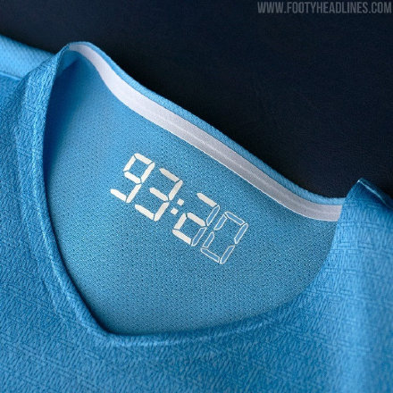 数字时钟暗纹图案将贯穿整件球衣,以此来纪念93:20史诗绝杀进球,向那个传奇赛季的球员们致敬。主场球衣将搭配天蓝色球裤和环纹球袜。