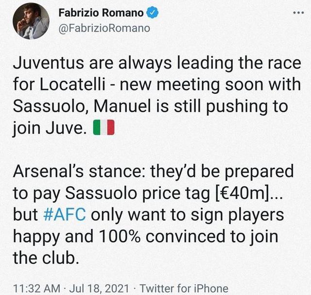 罗马诺表示:“尤文目前在洛卡特利的争夺战中处于领先,他们很快就会与萨索洛进行新一轮的会面,球员也在争取加盟尤文。阿森纳的立场是只希望签下百分百确信加盟球队并且对于加盟感到开心的球员。”