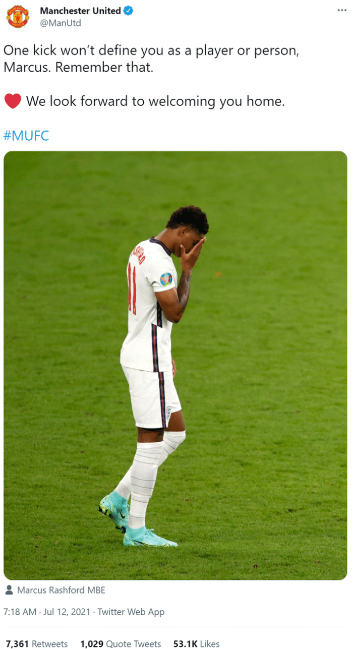 来源:直播车07-12 11:57直播车讯 今天凌晨,拉什福德在欧洲杯决赛中罚丢点球,赛后曼联官推发文安慰了这名球员。