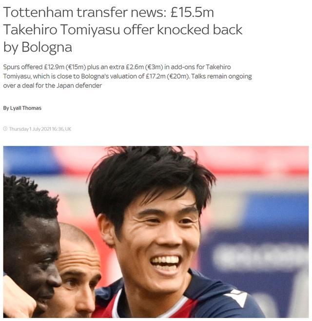 直播车讯 据天空体育报道,热刺已经为博洛尼亚送上一份价值1550万英镑的报价,求购队中日本中卫富安健洋,但遭到对方拒绝。