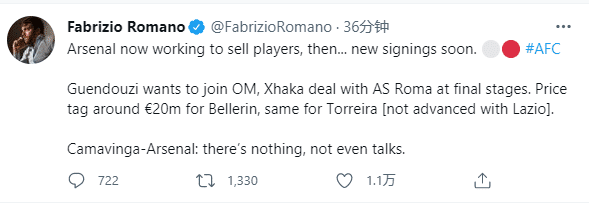 直播车讯 阿森纳目前正在出售球员,以筹集资金引援。他们为托雷拉和贝莱林都标价2000万。扎卡加盟罗马的转会谈判已进入最后阶段,托雷拉和拉齐奥的谈判没有太大进展,而贡多齐想加盟马赛。至于卡马文加,阿森纳并没有开启谈判。