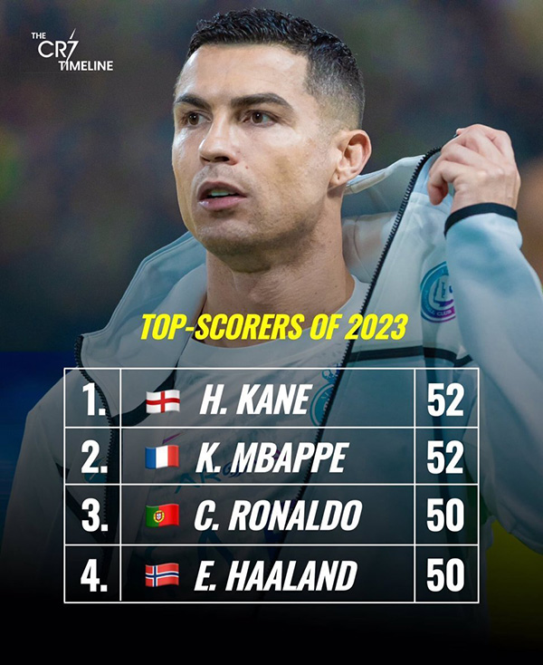 在他们身后,哈兰德和C罗分别以50球紧追不舍。而两人2023年还有比赛可踢,2023年究竟谁会是年度金靴,依然是未知数。