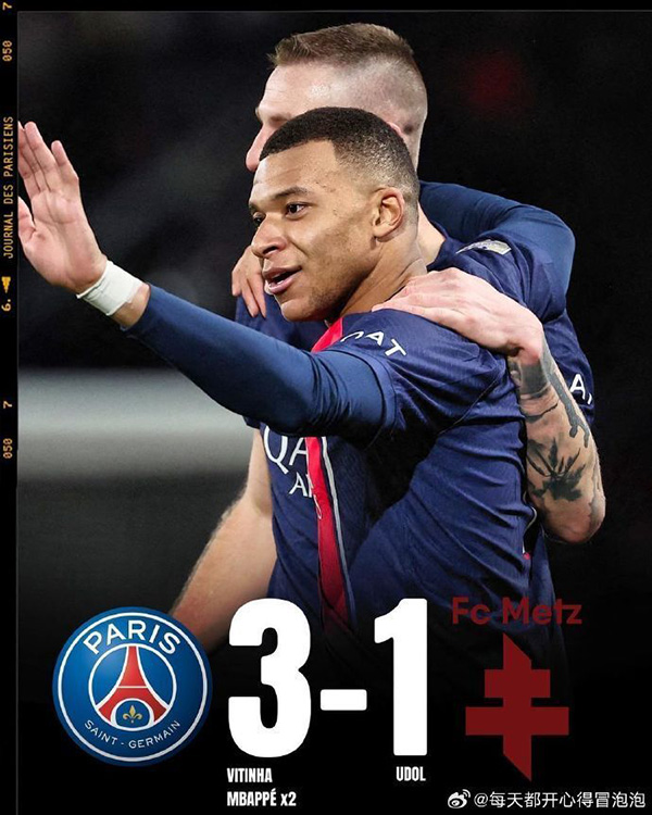 而在同时结束的法甲第17轮比赛中,迎来生日的法国天才姆巴佩先是在第60分钟打进世界波,随后又在第83分钟利用速度强吃对手完成梅开二度,帮助大巴黎3-1锁定胜局。