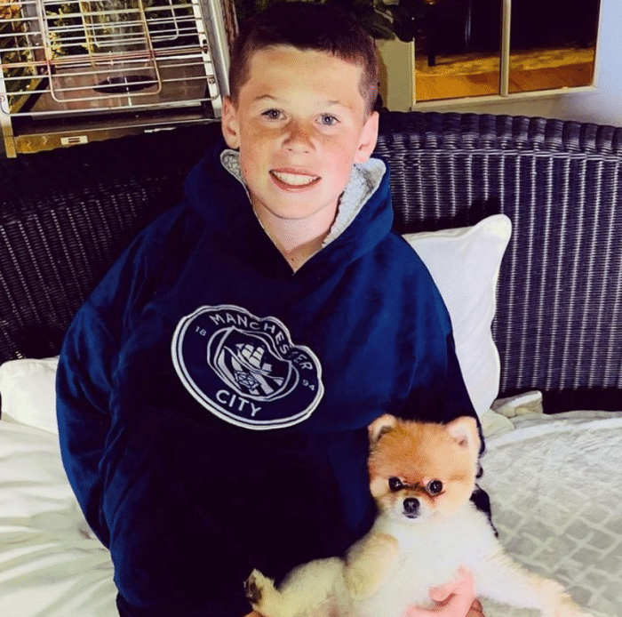 鲁尼目前是德比郡的主帅,但凯伊已经签约加入了曼联青训体系。然而,鲁尼妻子科琳最近分享了儿子抱着宠物狗的照片,其中小鲁尼却穿着一件胸前印有硕大曼城队徽的深蓝色连帽衫。