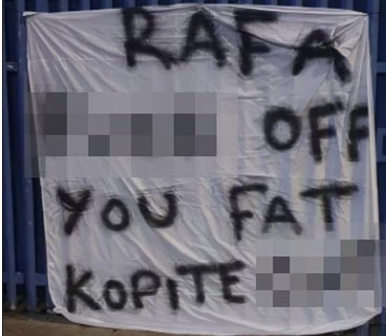 其中一条横幅的辱骂不堪入目,上面写道:“拉法,滚你X的(f**k off)!你这个利物浦拥趸的死肥杂x!”