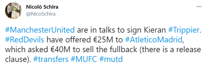 直播车讯 据知名记者尼科洛-斯基拉报道,曼联为特里皮尔报价2500万欧元,但马竞的要价是4000万欧元。