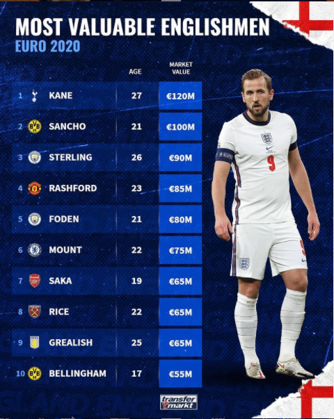 英格兰国家队身价排行:凯恩1.2亿欧元全队最高