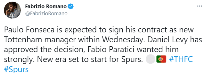 丰塞卡将在周三作为热刺新任主帅签下合同,列维已经批准了这一决定,帕拉蒂奇非常希望丰塞卡来执教球队。