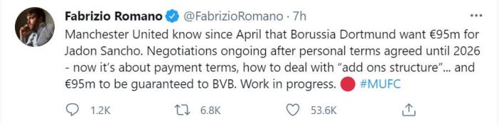 意大利记者罗马诺表示,曼联仍在与多特就转会费进行谈判,多特方面希望得到9500万欧元,双方正在敲定转会费支付方式、浮动奖金和条款等问题。