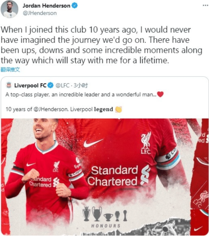 亨德森在2011年6月9日加盟利物浦,效力球队至今已过十年。今天他在推特上写道:“当我十年前加盟利物浦俱乐部时,我从没想到我们会走上如此精彩的一段旅程。”