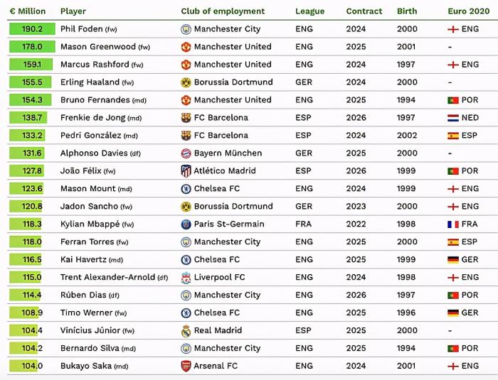 有趣的是,在排名前20位的最有价值球员名单中,有7名英格兰球员。而堪称国际足坛目前最火的年轻天才,号称梅西、C罗接班人的姆巴佩和埃尔林·哈兰德,则分别排在第12和第4位。