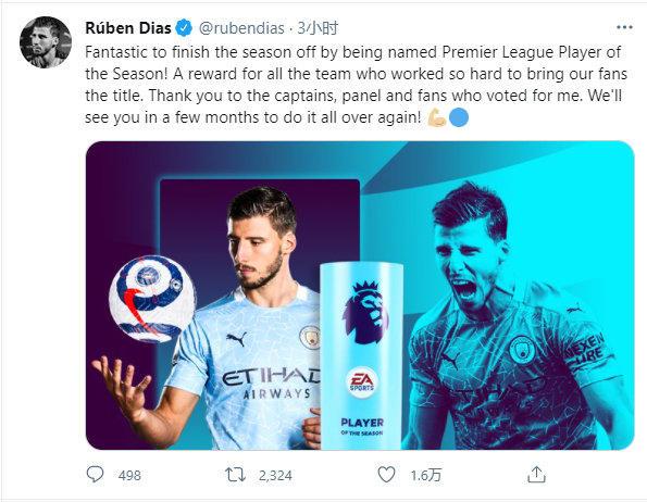 直播车讯北京时间昨天,曼城后卫鲁本-迪亚斯当选英超赛季最佳球员,今天他在推特上发表自己的获奖感言。