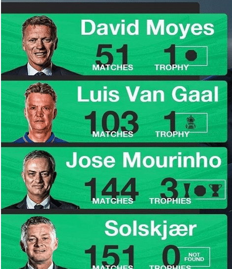 如图,这是后弗格森时代,各大主帅夺冠次数一览,莫耶斯带队踢了50场比赛,曼联拿到了一个社区盾杯冠军,这是后弗格森时代曼联的第一冠军。而随后,范加尔执教曼联期间,带队踢了103场比赛,拿到了1个足总杯冠军。而穆里尼奥执教期间,他带队踢了144场,拿到了社区盾杯、联赛杯和欧联杯冠军。而索尔斯克亚,目前带队踢了151场 比赛,还没有拿到任何一个冠军。