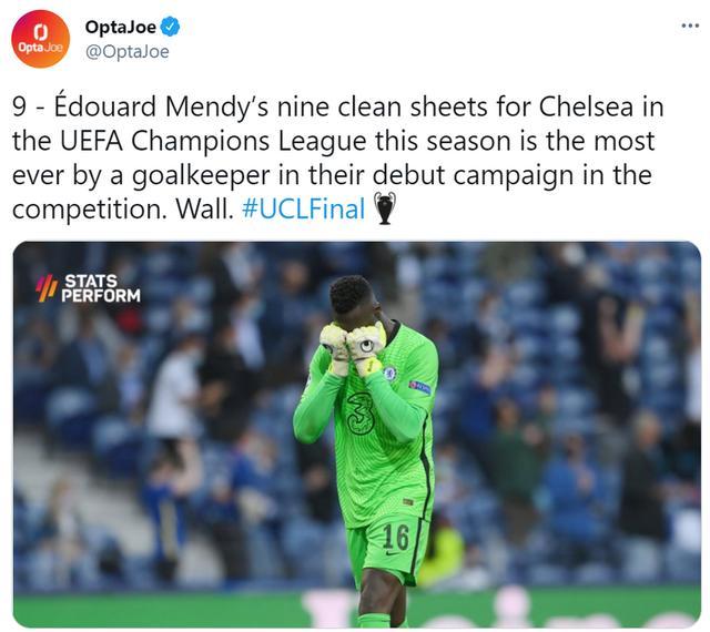 今天凌晨,切尔西在欧冠决赛中1-0击败曼城夺冠,本赛季,门迪一共参加了12场欧冠比赛,其中9次零封对手,追平了卡尼萨雷斯(2000-01赛季)和纳瓦斯(2015-16赛季)创造的单赛季欧冠零封纪录。