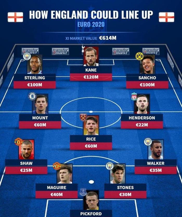 直播车讯 德国转会市场网站评选了英格兰队在本届欧洲杯上可能的首发阵容,头号球星凯恩领衔。