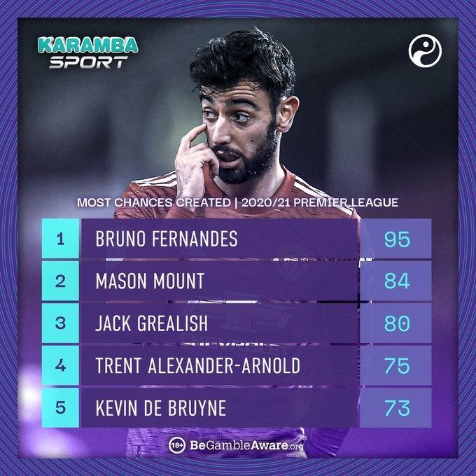 直播车讯 北京时间5月21日,本赛季英超即将结束。据Squawka统计,本赛季英超球员中创造机会最多的是曼联的B费,高达95次。芒特、格拉利什分居第二第三。