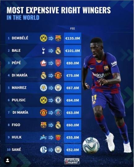 直播车讯 ,德转列出了足坛右边锋转会费排行榜。登贝莱1.35亿欧高居居首,贝尔、佩佩分居第二第三。