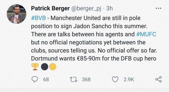 Berger写道:“曼联依然处在桑乔争夺战中处于杆位 ,他的经纪人表示俱乐部尚未进行正式谈判,到目前没有官方报价,多特蒙德要价8500万-9000万欧。”