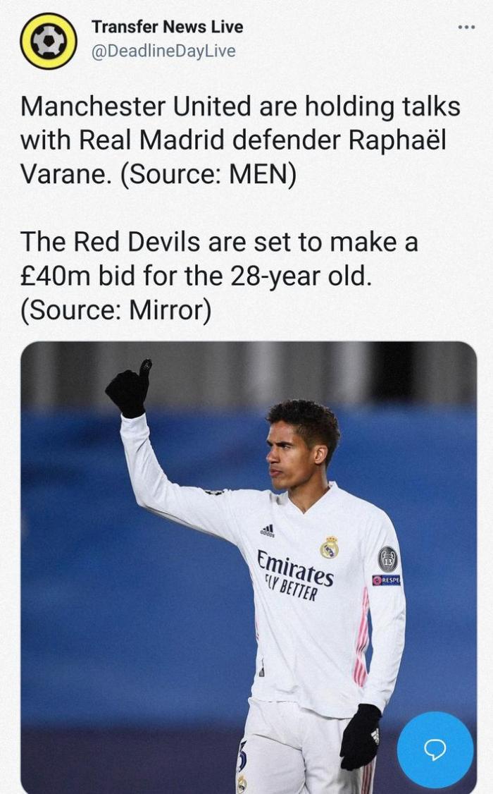 直播车讯 北京时间5月15日,据英国《镜报》报道,曼联希望引进皇马中卫瓦拉内,准备报价4600万欧元。