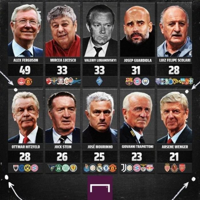 直播车讯进球网统计主教练冠军数,弗格森49冠高居榜首,瓜迪奥拉31冠排第四,穆里尼奥25冠第八,温格21冠第十。