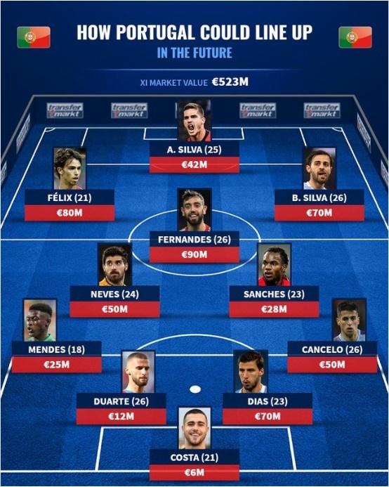 直播车讯 北京时间5月10日,德转列出了葡萄牙国家队未来可能阵容,B费领衔,C罗不在列。