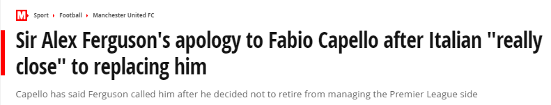 卡佩罗表示:“我必须承认当时我非常想要执教曼联,01年成功带领罗马夺得意甲冠军后,我有和曼联谈论过这件事,但没有签任何协议。因为赛季结束时弗格森选择了继续执教。几天后弗格森打电话给我和我道歉。因为当时他的妻子希望他离开足球。我们的沟通很友好,我跟他说没事的。”