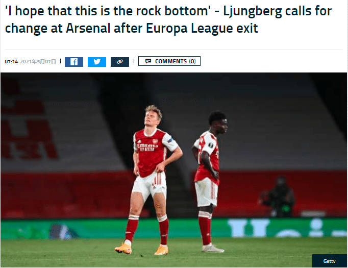 来源:直播车05-07 15:41直播车讯 北京时间5月7日,欧联半决赛次回合阿森纳0-0战平比利亚雷亚尔,总比分1-2遭到淘汰无缘决赛。前阿森纳临时主帅、BT体育评论员永贝里希望阿森纳现在已经触底,接下来可以反弹了。