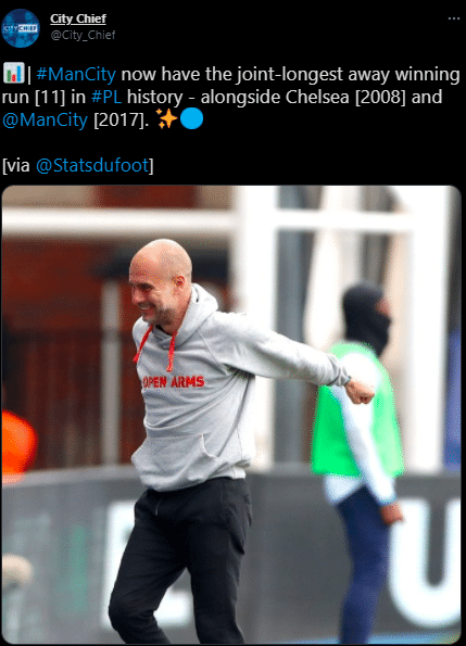 直播车讯北京时间5月2日,英超第34轮,曼城客场2-0击败水晶宫,取得英超联赛客场的11连胜。数据统计,这是曼城最长的客场连胜纪录。而这项纪录,之前是由曼城自身还有切尔西共同保持的。